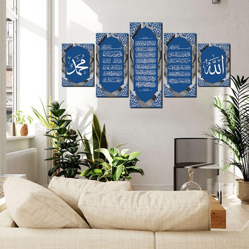 Ayatul Kursi, Surah Ikhlas, Surah Nas, Allah and Muhammad (saw) Islamic Art: This 5-panel canvas features Ayatul Kursi and 2 Qul calligraphy, alongside beautifully crafted Allah and Muhammad calligraphy, creating a stunning and meaningful centerpiece for your space.